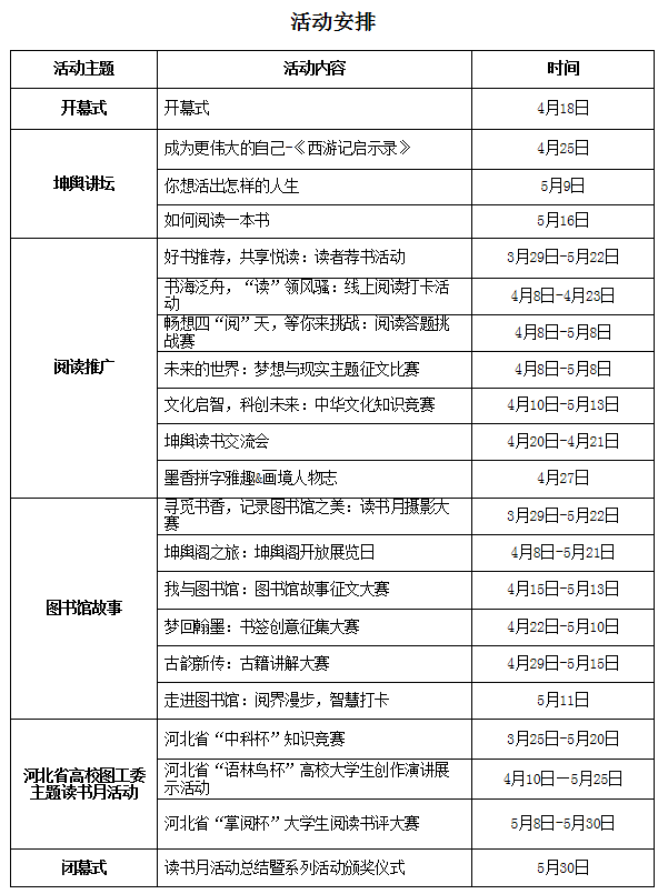 讀書月系列活動采取線下和線上聯動方式舉辦,以線下活動為主,線上活動為輔。詳情請關注河北大學微信公眾號、“河北大學青年”微信公眾號、河北大學圖書館網站(http://lib.hbu.edu.cn)、河北大學圖書館微信公眾號及“河大微圖”公眾號。