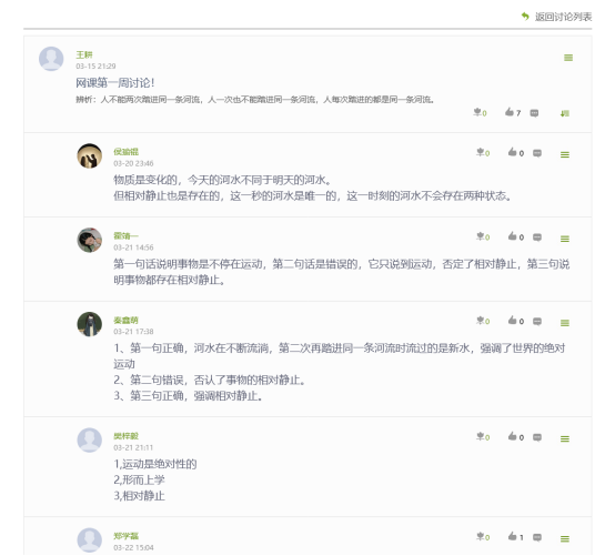 在課后提交作業(yè)及考核階段,臨近下課前10分鐘,王耕老師將本節(jié)課的思考題發(fā)布在學(xué)習(xí)通的討論板塊,并要求在課后每位同學(xué)都需回帖發(fā)表自己的觀點和看法,并計入平時成績考核。最后在檢查了幾名同學(xué)的筆記后,伴隨著下課的鈴聲,一堂充實生動的線上課就結(jié)束了。在課下,時常有同學(xué)會在QQ群和王耕老師交流課上內(nèi)容,王耕老師每每耐心認(rèn)真解答,獲得了學(xué)生們的一致好評。