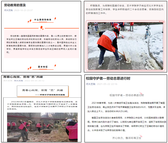 自2020年以來,藝術學院利用微信公眾號共發布以勞動教育為主題的推文近20余篇,通過宣傳進一步加強勞動教育的成果展示,提升和深化勞動教育效果,深化勞動內涵,教育引導學生們學會勞動、學會勤儉、學會感恩、學會助人,立志成長為德智體美勞全面發展的社會主義建設者和接班人。