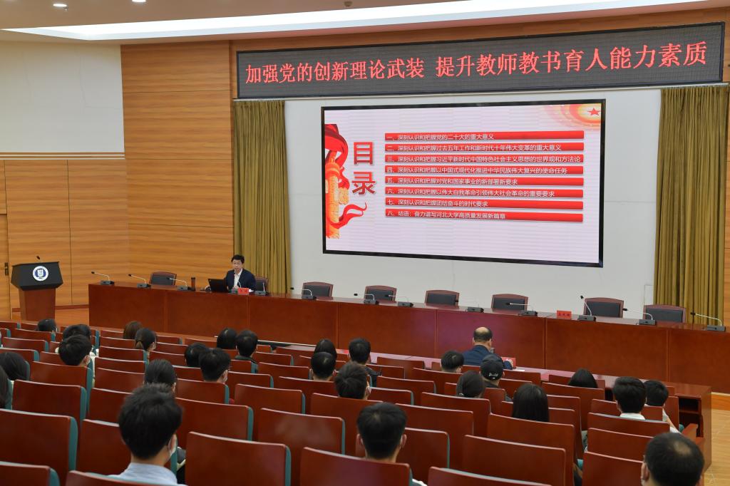 郭健遵循黨的二十大報告內在邏輯,從深刻認識和把握黨的二十大的重大意義、深刻認識和把握過去五年工作和新時代十年偉大變革的重大意義、深刻認識和把握習近平新時代中國特色社會主義思想的世界觀和方法論、深刻認識和把握以中國式現代化推進中華民族偉大復興的使命任務、深刻認識和把握對黨和國家事業的新部署新要求、深刻認識和把握以偉大自我革命引領偉大社會革命的重要要求、深刻認識和把握團結奮斗的時代要求等七個方面,對黨的二十大精神進行了整體解讀和全面闡釋。郭健立足支撐教育強國、科技強國、人才強國建設,回顧了河北大學的百年歷程,介紹了推動實現學校高質量發展的歷史基礎、寶貴機遇、發展優勢和基本工作思路,勉勵新入職教師厚植家國情懷、堅持立德樹人、涵養道德學識、融入學校發展,為辦好人民滿意的教育作出新的更大貢獻。