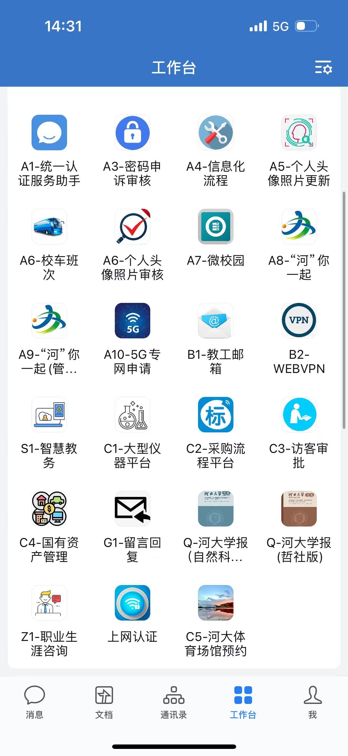 3. 或在企業微信(APP或PC版客戶端)中工作臺打開學校的企業微信應用,如統一認證服務助手、信息化流程、WEBVPN等;以河北大學企業微信用戶的身份,使用企業微信的高級功能,如視頻會議、群直播、群聊等。