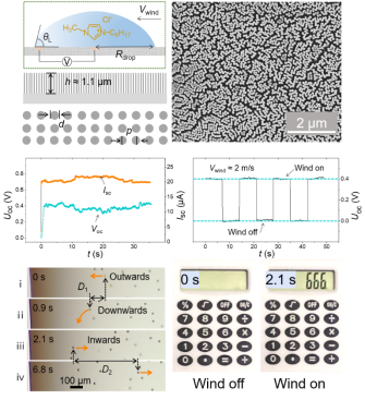 傳統(tǒng)風(fēng)力發(fā)電技術(shù)往往需要風(fēng)速大于5m/s來旋轉(zhuǎn)葉片,占據(jù)世界較大面積的低風(fēng)速地域不能有效利用風(fēng)力發(fā)電技術(shù)。本研究發(fā)現(xiàn)當(dāng)離子液體液滴位于具有毛細管穩(wěn)定三相接觸線的超疏水納米線陣列上時,可以靈敏地將風(fēng)吹引起的空氣/液體界面摩擦轉(zhuǎn)化為內(nèi)部旋轉(zhuǎn),形成分層循環(huán)流動。這種納米密閉空間內(nèi)的離子液體流動會自發(fā)地誘導(dǎo)正離子和負離子的重新分配,并持續(xù)產(chǎn)生電能,基于此液滴的風(fēng)電場可以在低風(fēng)速下產(chǎn)生60 V的電壓,這是一種與以往液滴發(fā)電不同的工作機制。