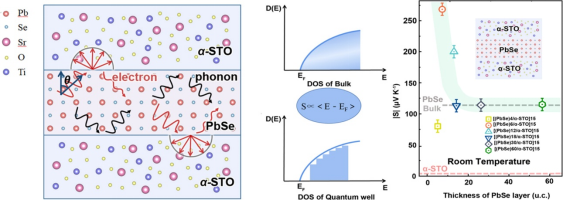 在另一項工作中,該團隊寧興坤副教授等人以鉛基二元硫族半導體PbX(X=Te, Se)為研究對象,采用脈沖激光沉積技術構建了PbX(X=Te, Se)/非晶SrTiO3(a-STO)多重量子阱超晶格,利用量子限域效應大幅提升了其電學性能,在室溫下分別獲得了高達40.9 μW cm-1K-2(PbTe/ a-STO)和24.5 μW cm-1K-2(PbSe/ a-STO)的熱電功率因子。此外,作者通過調控量子阱的厚度,使其在聲子平均自由程尺度范圍內,降低了熱導率,實現了PbX(X=Te, Se)基熱電材料電、熱輸運的協同調控。相關工作以河北大學為第一單位分別發表在Advanced Functional Materials, 2023, 33:2303981和Acta Materialia, 2024, 262:119452,寧興坤副教授為文章的第一作者,王淑芳教授為通訊作者。