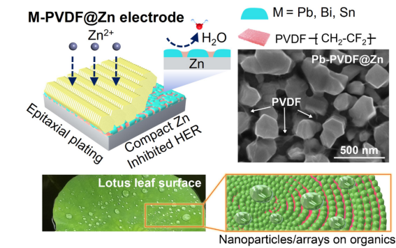 基于金屬鋅負極的水系可充鋅電池安全性高、資源豐富、環境友好,在大規模儲能領域中具有重要應用前景。然而,傳統鋅負極可逆性低,存在枝晶、析氫、腐蝕的問題,嚴重限制了水系可充鋅電池的實際應用。受自然界“荷葉效應”的啟發,該團隊提出了在鋅負極表面原位構建超疏水“異質金屬-聚合物”復合SEI膜(固體電解質界面膜)的策略,顯著提升了鋅負極的穩定性。通過一步化學置換法,可控制備了一系列異質金屬-聚合物復合SEI膜,如Pb-PVDF,Bi-PVDF和Sn-PVDF膜(PVDF為聚偏氟乙烯)。以Pb-PVDF復合SEI膜為主要研究對象,其具有類似于荷葉表面的微結構,展示出了超疏水性,電解液接觸角高達到154.9°,是已報道人工SEI膜的記錄值。所制備的Pb-PVDF@Zn電極實現了超長循環壽命(達8100 h)和高深度放電循環穩定性(85.3%放電深度,> 800 h),是傳統鋅負極循環壽命的~160倍。這項工作為高性能金屬電極設計與界面化學調控提供了新思路。