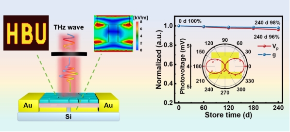 太赫茲(THz)波是指頻率為0.1 THz-10 THz的電磁波,具有高穿透性、生物安全性和指紋特性等獨特優勢,被廣泛應用于生物醫學、安全檢查、通信和遙感等領域。THz偏振探測技術能夠捕獲多維信息,包括強度,相位和偏振狀態等,在生物醫學成像領域中具有潛在應用價值。然而傳統THz探測技術存在系統復雜、探測功能單一、響應速度慢、探測靈敏度低等問題。為了實現小型化、高效THz偏振探測,團隊提出了利用新型鈣鈦礦/超表面的熱電效應實現室溫下高效THz偏振探測及成像,該結構的設計增強了局部場熱電效應和偏振響應。響應高達94 V/W,響應時間μs量級,噪聲等效功率低至5.03 pW/Hz1/2,各向異性比為1.38。此外,高溫、高濕度和偏振成像實驗驗證了器件具有良好的穩定性。這項工作為實現高性能、穩定的THz偏振檢測技術提供了新的途徑,在高分辨率醫學成像、安全檢測、醫工交叉等領域具有巨大的應用潛力。