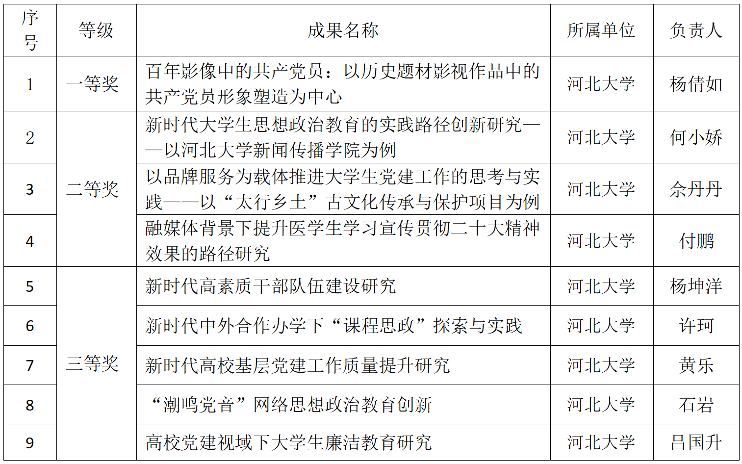 近日,2023年河北省高校黨建研究優(yōu)秀成果獲獎名單公布,我校《百年影像中的共產(chǎn)黨員:以歷史題材影視作品中的共產(chǎn)黨員形象塑造為中心》等9項黨建研究成果獲獎,其中一等獎1項,二等獎3項,三等獎5項。
