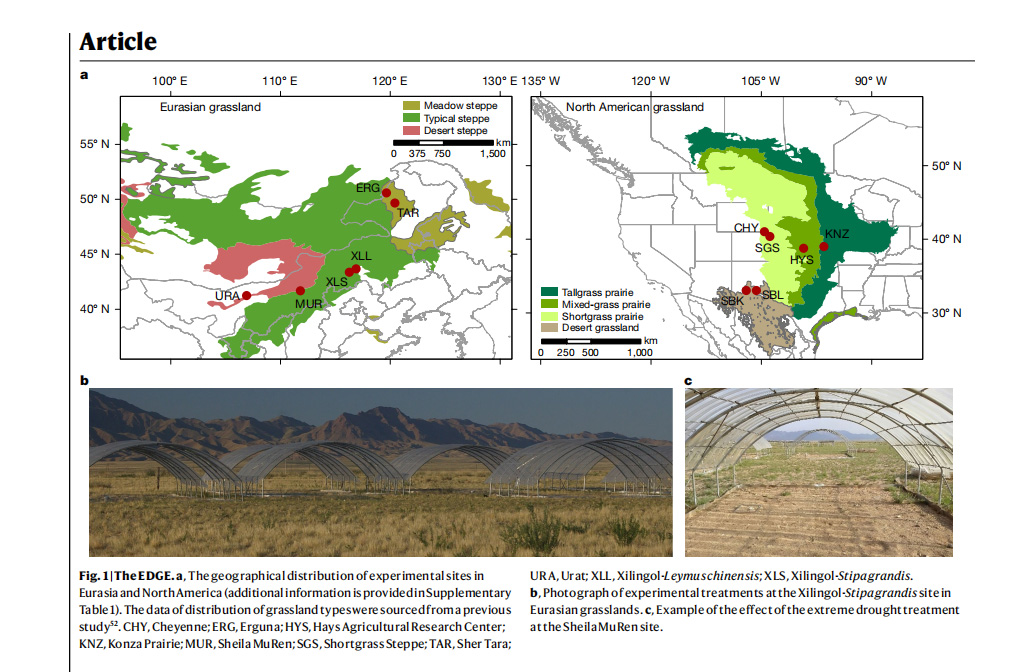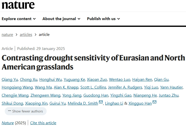 論文信息:Qiang Yu, Chong Xu, Honghui Wu, Yuguang Ke, Xiaoan Zuo, Wentao Luo, Haiyan Ren, Qian Gu, Hongqiang Wang, Wang Ma, Alan K. Knapp, Scott L. Collins, Jennifer A. Rudgers, Yiqi Luo, Yann Hautier, Chengjie Wang, Zhengwen Wang, Yong Jiang, Guodong Han, Yingzhi Gao, Nianpeng He, Juntao Zhu, Shikui Dong,Xiaoping Xin, Guirui Yu, Melinda D. Smith*, Linghao Li & Xingguo Han*.?2025. Contrasting drought sensitivity of Eurasian and North American grasslands.Nature,https://doi.org/10.1038/s41586-024-08478-7