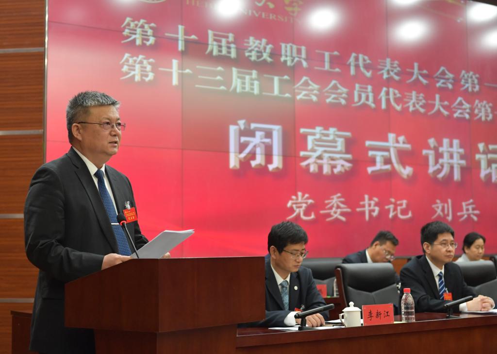 黨委書記劉兵在閉幕式上講話,他代表學校黨委向大會圓滿完成既定議程表示祝賀,向各位代表履職盡責、建言獻策表示感謝。他表示,把發展藍圖變成美好現實,需要全校廣大干部師生心往一處想、勁往一處使,用苦干實干詮釋責任、用拼搏奉獻成就事業。就進一步加強教代會、工會建設,他指出,要始終堅定正確政治方向,把教代會、工會建設成為學校黨委可以信賴、可以依靠、可堪重任的先進群眾組織,帶領廣大教職工牢記為黨育人、為國育才使命,全面落實立德樹人根本任務,圍繞中心、服務大局;要不斷增強服務能力水平,努力成為教職工信得過、靠得住、離不開的知心人、貼心人,不斷提升服務精度、拓展服務廣度、提高服務溫度,扎扎實實為教職工做好事、辦實事、解難事;要強化教職工思想政治引領,多做統一思想、化解矛盾、增進感情、激發動力的工作,多做強信心、聚人心、暖人心的工作,使廣大教職工努力做學校改革發展的支持者、參與者和推動者。