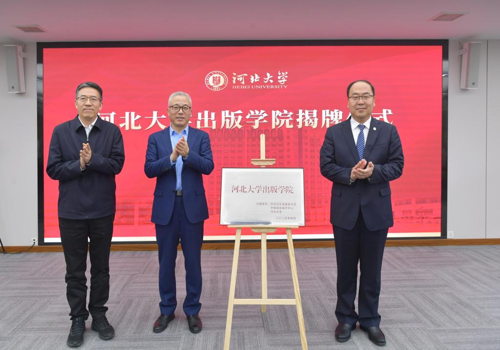 肖振軍副主任、孫寶林主任、孟慶瑜校長共同為河北大學出版學院揭牌